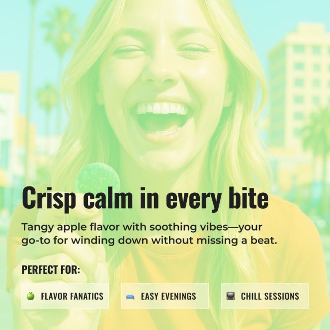 For those who want their relaxation served with a refreshing zing, these sativa-dominant gummies blend 15mg of hemp-derived Delta-9 THC with the crisp, mouthwatering tartness of just-picked green apples.